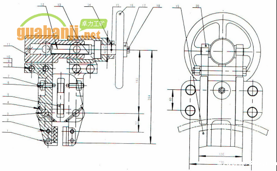 1——左阻链架 2——螺栓M20×130 3——螺母M20