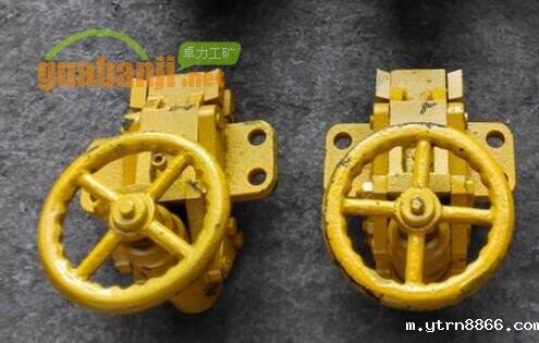 【闸盘式紧链器】安装于减速器第二轴上。它是由手轮、导轮、支撑板、钳臂、闸块等组成。它借助于输送机电动机的动力,涨紧或松开输送机刮板链。当顺时针转动手轮时,通过导套内的丝杠带动钳臂合拢,从而使闸块抱住闸轮起到制动作用。反之,若逆时针松开手轮则钳臂张开解除制动。